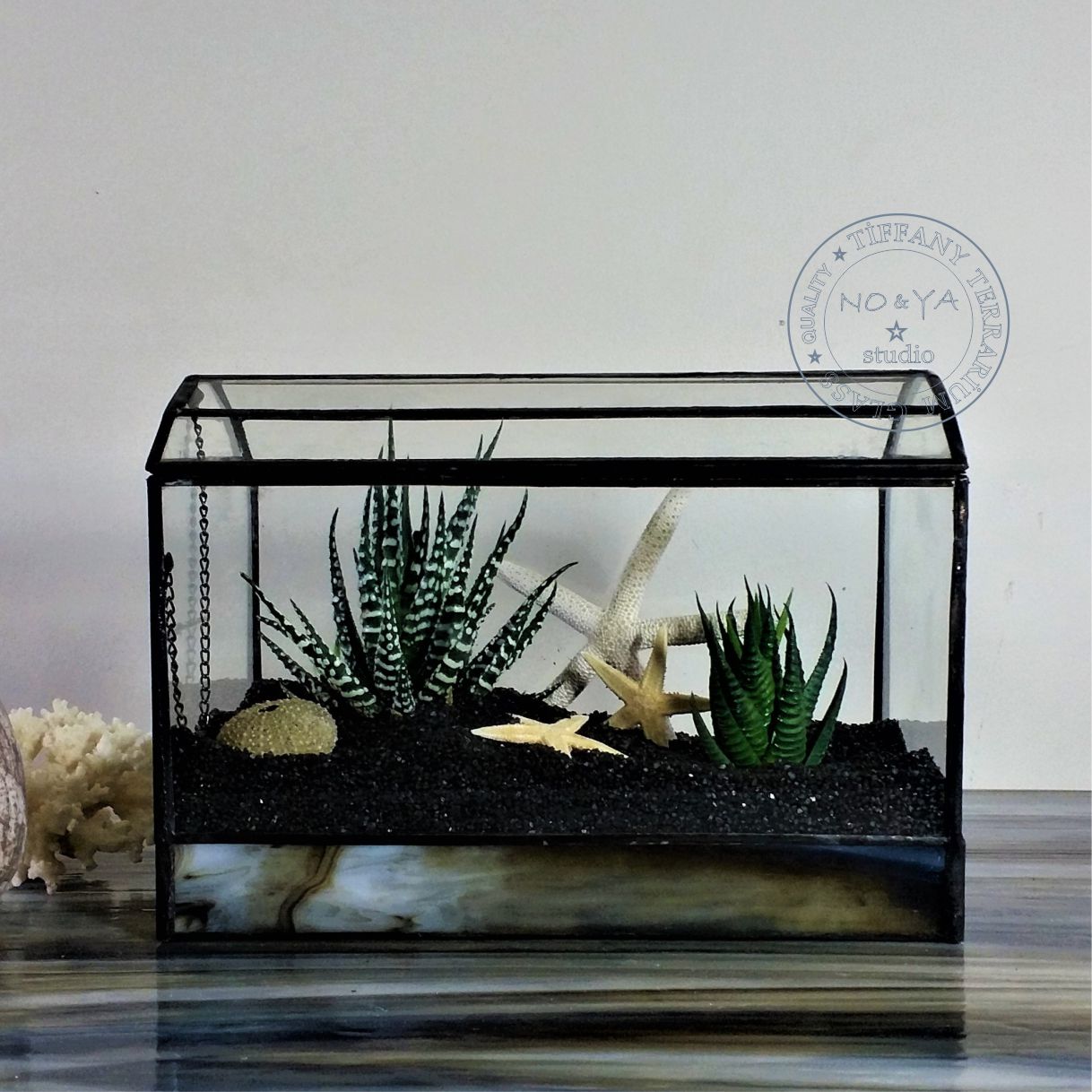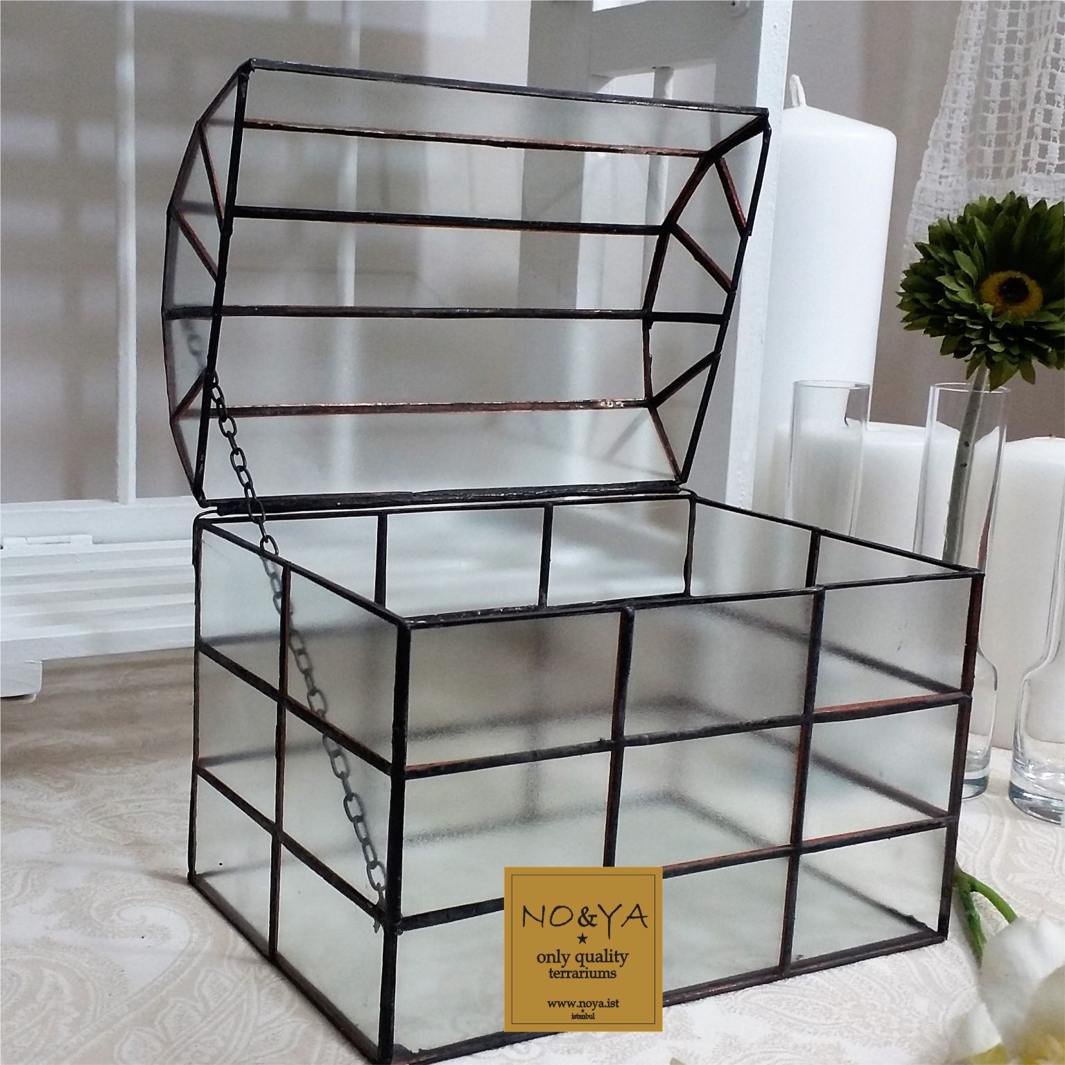 NO&YA teraryum modelleri, yine NO&YA Atölye tasarımıdır. Tamamen el yapımı olan teraryumlar, tiffany tekniği ve pirinç profiller kullanılarak zahmetli bir üretim sürecinden sonra, NO&YA Stıdio tarafından iç düzenlemeleri yapılarak da satışa sunulmaktadır.